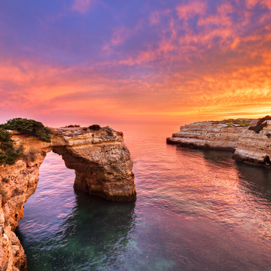 The Algarve is famous for its breathtaking cliffs, golden beaches, lush bays and sandy islands, as well as its picturesque fishing villages and harbours. During the day, you can spend time relaxing on the sun-drenched sands or swimming, sailing and snorkelling in the ocean. This region in mainland Portugal is also renowned for its variety of high-end golf resorts, which attract players from around the world.
