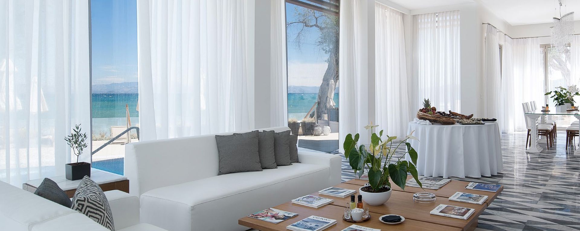 At Domes Miramare, there are a wide variety of rooms and suites ranges for you to choose from, including Emerald Retreat sea view rooms with lovely views of the splendid Ionian coastline from its patio, and the sumptuous Grand Pavilion Suite Waterfront with private pool and large terrace area. All of the rooms here are symphonies of pale marble and soft, pastel hues, designed to maximise your sense of wellbeing in a setting that is tranquil, intimate and indulgent.